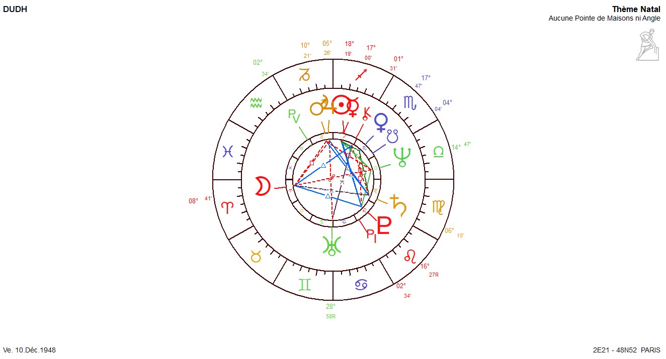 Comme pour marquer la continuité avec les apports de la Révolution française, la DUDH intervient avec un Neptune également en Balance (c’est-à-dire un cycle de Neptune plus tard) soulignant les aspirations de justice et d’équité et un Pluton dans le Lion, c’est-à-dire un demi-cycle de Pluton plus tard et presque en conjonction avec l’Uranus de la Première République qui réaffirme l’exigence des libertés individuelles. Uranus à la fin des Gémeaux nous parle de fraternité !