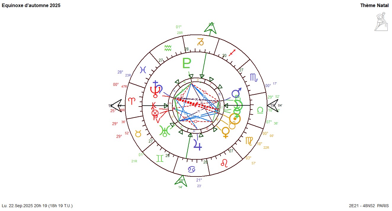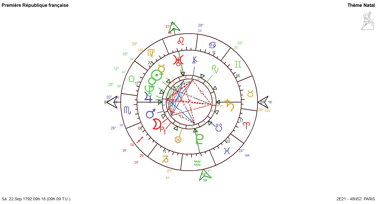 Ce travail a le mérite de mettre le projecteur sur la France (et sa destinée) car le thème de l’équinoxe d’automne, calculé pour Paris, constitue pour notre nation la Révolution solaire de sa Première République avec ses valeurs fondamentales. Je rappelle que le génie de la Révolution française a fait que les astronomes de l’époque (peut-être un peu astrologues ?) ont inventé le calendrier révolutionnaire en l’articulant exactement sur l’astronomie et de ce fait sur le Zodiaque de la Terre (avec ses 4 temps forts, équinoxes et solstices), et qu’il fut décidé que le calendrier des Français débuterait dorénavant en même temps que leur République, à l’équinoxe d’automne, le 22 septembre 1792 (comme par hasard le surlendemain de la victoire des armées révolutionnaires à Valmy contre une coalition des monarchies européennes). Ainsi en étudiant le thème de l’équinoxe d’automne pour Paris, nous étudions l’année solaire de la France en tant que République.