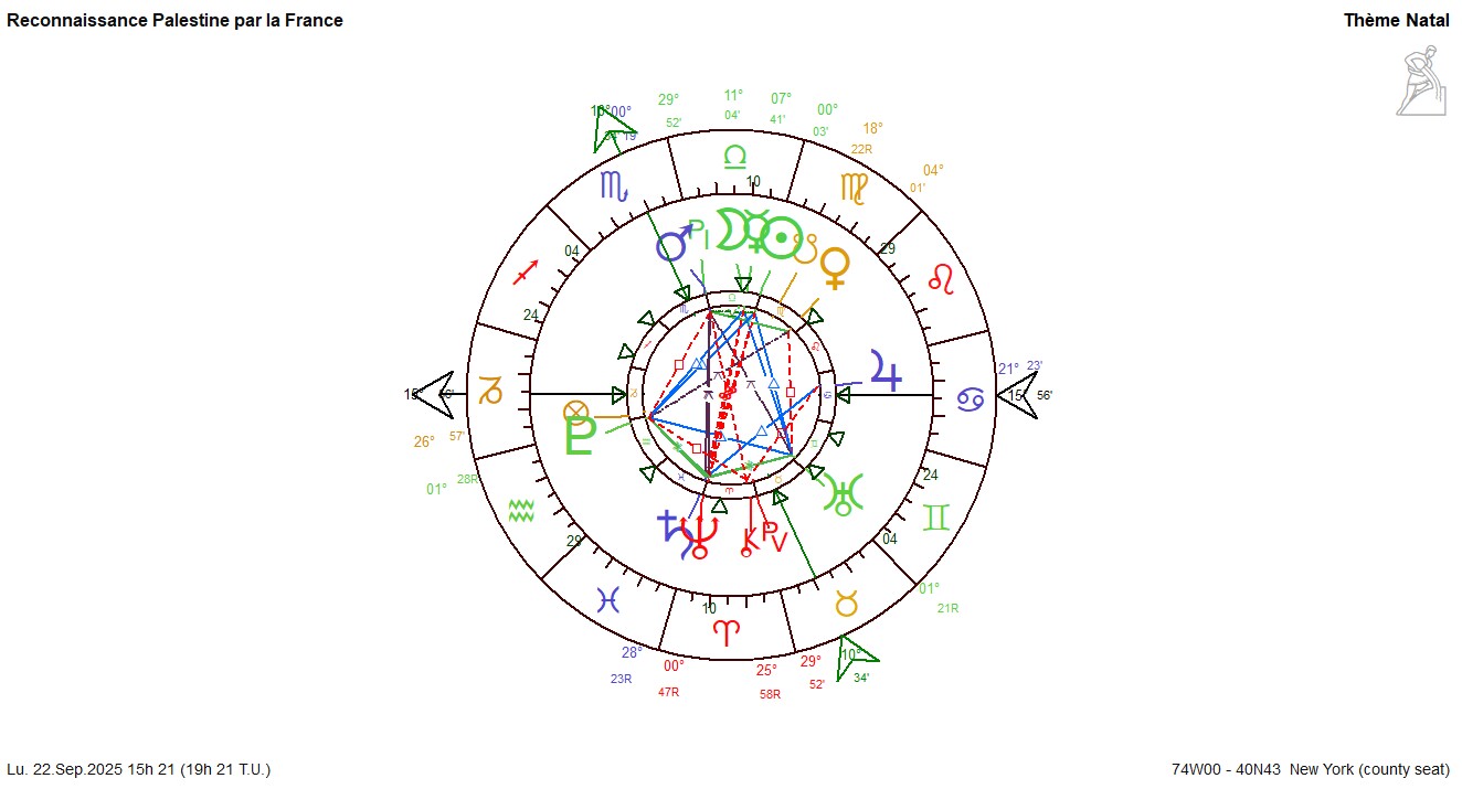 La reconnaissance de la Palestine par la France, la Grande-Bretagne (qui est à l’origine en quelque sorte de l’implantation des Juifs en Palestine depuis la Déclaration Balfour de 1917 et qui était la puissance mandataire de la Palestine après le démantèlement de l’Empire ottoman), le Canada, etc. peut sauver l’honneur occidental sur le point de succomber, mais elle devra être suivie d’actes concrets pour sauver les Palestiniens qui survivent encore. C’est ce que l’on voit sur la carte du Ciel de la Déclaration de reconnaissance de la Palestine par le Président français, qui est intervenue le jour même de l’équinoxe d’automne, le 22 septembre 2025 à 15H21 à New-York :